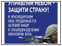 В Краснодарском крае продолжается целевой набор в спецподразделения операторов БПЛА При подписании контракта на военную службу будут доступны все действующие меры поддержки участников спецоперации. Более подробная информация здесь