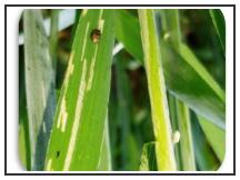 Личинки повреждают яровые и озимые зерновые культуры. Повреждения личинками флагового и подфлагового листьев приведут к существенным потерям урожая.