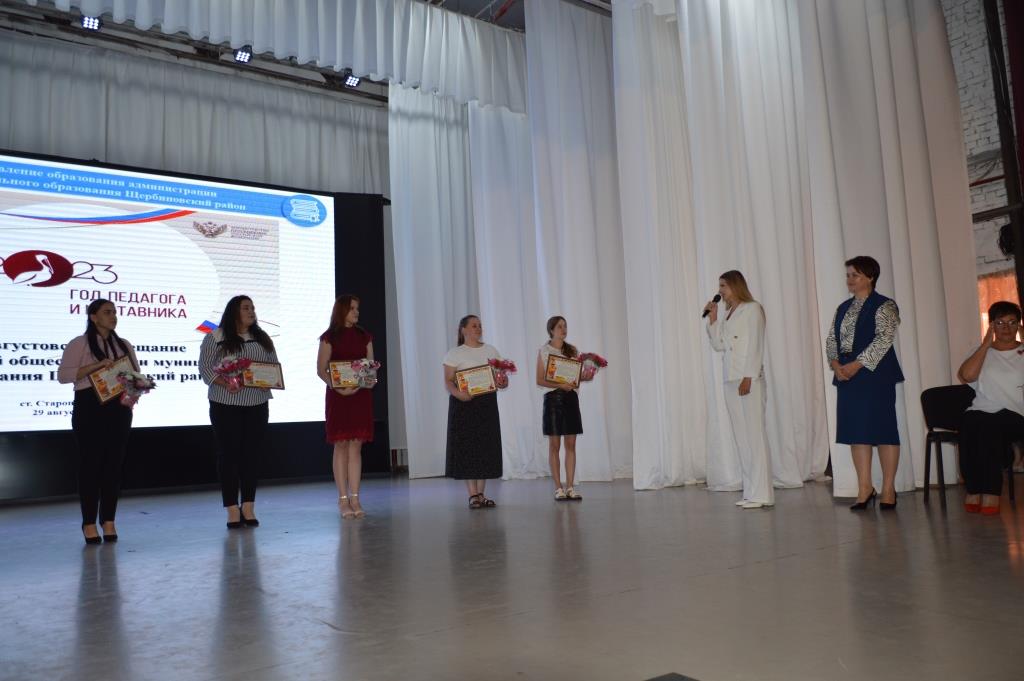 Почетной грамотой министерства образования, науки и молодежной политики Краснодарского края «За высокие профессионализм, добросовестный труд и большой вклад в систему дошкольного образования Краснодарского края» награждена Диана Руденко – заведующая детским садом № 18 села Екатериновка, Грамотой министерства образования, науки и молодежной политики Краснодарского края и Кубком победителя за 1 место в 14-ой Всекубанской спартакиаде «Спортивные надежды Кубани» награждена директор СОШ № 1 Лариса Гарькавая, Грамотой министерства образования, науки и молодежной политики Краснодарского края за 2 место в краевом смотре – конкурсе на лучшую постановку физкультурной работы и развитие массового спорта среди школьных спортивных клубов награждается команда школьного спортивного клуба «Здоровая Россия» СОШ № 2 – руководитель Ольга Турсенина, Грамотой министерства образования, науки и молодежной политики Краснодарского края за 2 место в краевом смотре – конкурсе на лучшую постановку физкультурной работы и развитие массового спорта среди школьных спортивных клубов награждена Ирина Закалина – руководитель школьного спортивно клуба «Олимпиец» СОШ № 1 станицы Старощербиновской.