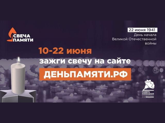 10 июня по всей России стартует онлайн-акция «Свеча памяти». До 22 июня на сайте деньпамяти.рф каждый может зажечь свою виртуальную свечу и почтить память героев Великой Отечественной войны.