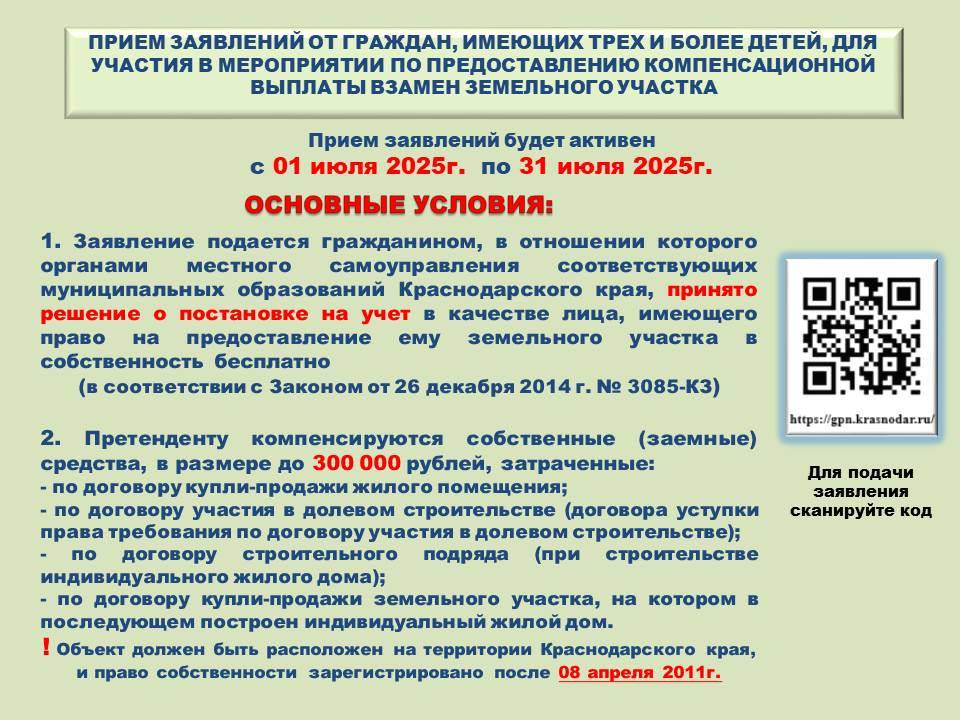 осуществляет прием заявлений от граждан, имеющих трех и более детей, состоящих на учете в качестве лиц, имеющих право на предоставление в собственность бесплатно земельного участка, без ограничения по дате принятия этого решения, для получения компенсационной выплаты из бюджета Краснодарского края для компенсации собственных (заемных) средств, затраченных на приобретение (строительство) жилого помещения, а также на приобретение земельного участка, на котором в последующем был построен индивидуальный жилой дом, которые расположены на территории Краснодарского края, и если право собственности было зарегистрировано после 8 апреля 2011 года.