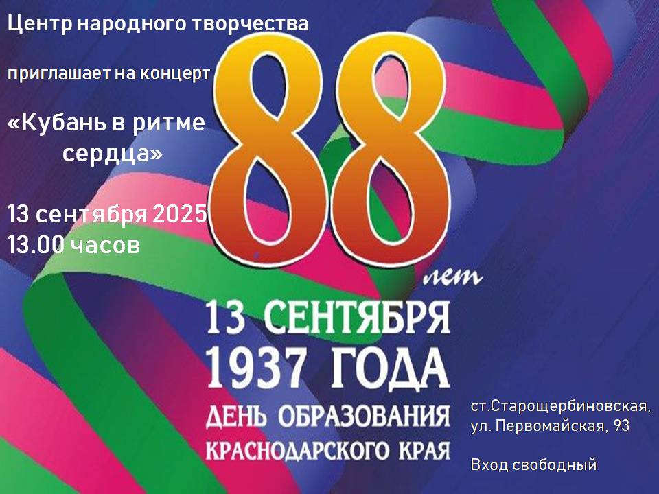 Центр народного творчества станицы Старощербиновской приглашает жителей района 13 сентября в 13.00, в День образования Краснодарского края, на праздничный концерт. Вход свободный!