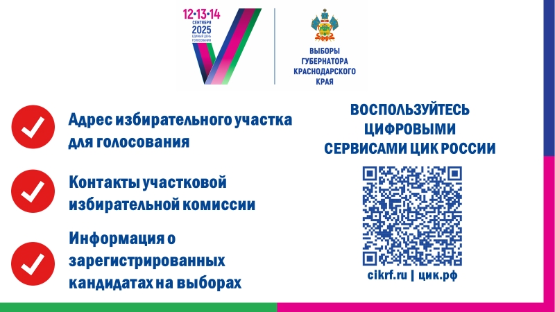 Приглашаем избирателей посетить официальный сайт избирательной комиссии Краснодарского края, на котором размещена актуальная информация об организации и проведении выборов в баннере «Всё о выборах в дни голосования 12-13-14 сентября 2025».
