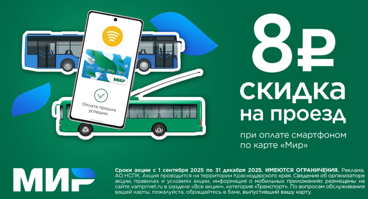 В период с 1 сентября по 31 декабря 2025 года на территории Краснодарского края Акционерным обществом «Национальная система платежных карт» проводится социально ориентированная транспортная акция, направленная на развитие национальных платежных инструментов.
