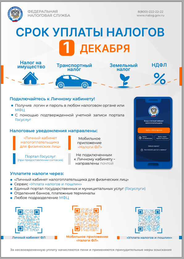 Владельцам земельных участков, транспортных средств, домов, квартир и другой недвижимости нужно уплатить имущественные налоги за 2024 год до 1 декабря. Не позднее чем за 30 дней до этой даты владельцы собственности получат налоговые уведомления для уплаты налогов.