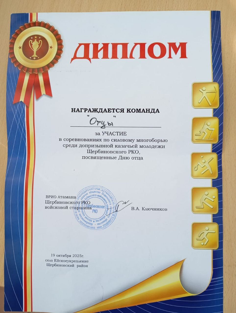 Сегодня мы отмечаем один из самых душевных праздников – День отца!В честь этого праздника Щербиновское районное казачье общество и "Центр физкультурно массовой и спортивной работы с населением" станицы Старощербиновской организовали спортивные соревнования «Силовое многоборье», среди допризывной казачьей молодёжи, где наши замечательные папы вместе с детьми смогли проявить свои лучшие качества! Соревнования прошло в центральном парке села Ейское Укрепление. Поприветствовали всех участников заместитель главы района, исполняющий обязанности атамана Щербиновского районного казачьего общества Виталий Ключников и глава Ейскоукрепленского сельского поселения Светлана Рассолова. Программа соревнований включала: -подтягивание на перекладине, -метание гири, -гиревой спорт, -перетягивание каната Все участники показали невероятную силу духа, сплоченность и, конечно же, отличное чувство юмора. Места распределились следующим образом: 1 место - Ейскоукрепленское ХКО, 2 место- Старощербиновское СКО, 3 место - Новощербиновское ХКО. А команда "Отцы", которая состояла из пап наших казачат, достойно выступила, и получила грамоту за участия в соревнованиях. После всех мероприятий атаман Александр Голенко и казаки накормили всех праздничным обедом, приготовленным в полевых условиях.
