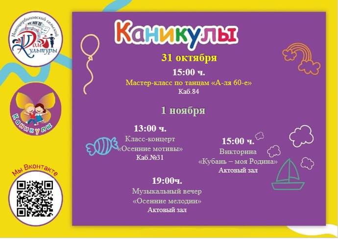Многие ребята выбирают осенние каникулы для того, чтобы посетить учреждения культуры, где для них будут организованы веселые и увлекательные культурно-досуговые мероприятия. Осенние каникулы в учреждениях культуры — это настоящий праздник для детей, где каждый сможет окунуться в атмосферу творчества, веселья и открытий, которые запомнятся надолго. Поэтому, предлагаем ознакомиться с афишами, чтобы не пропустить важные мероприятия.