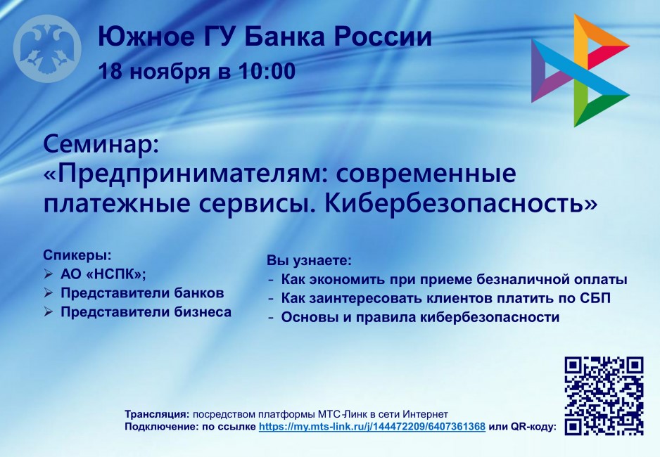 Южное главное управление Центрального банка Российской Федерации приглашает представителей бизнес-сообщества принять участие в вебинаре «Предпринимателям: современные платежные сервисы. Кибербезопасность», который состоится 18 ноября 2025 года в 10:00.