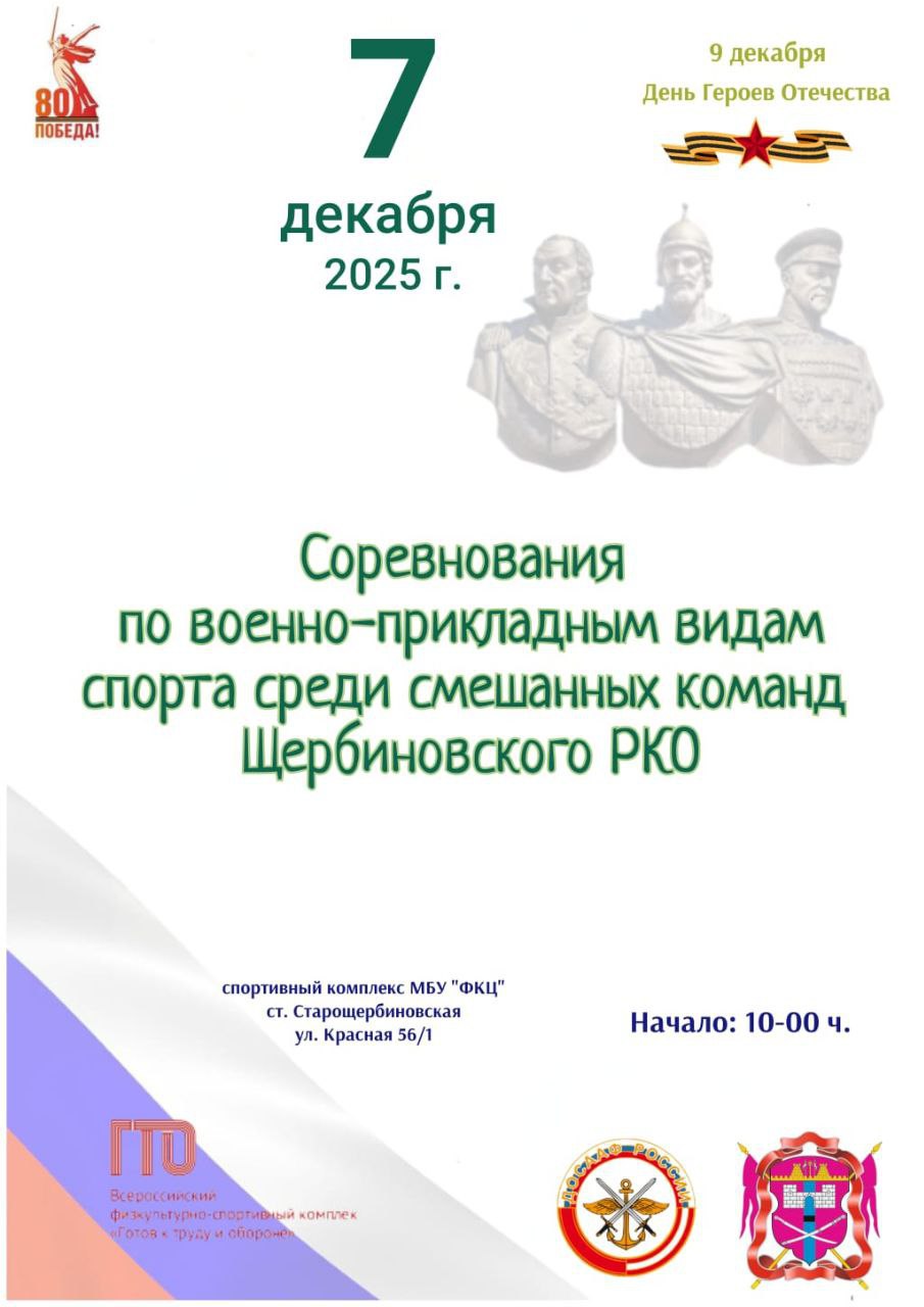 Приглашаем вас 7 декабря на соревнования по военно-прикладным видам спорта среди смешанных команд Щербиновского районного казачьего общества. Мероприятие приурочено ко Дню Героев Отечества
