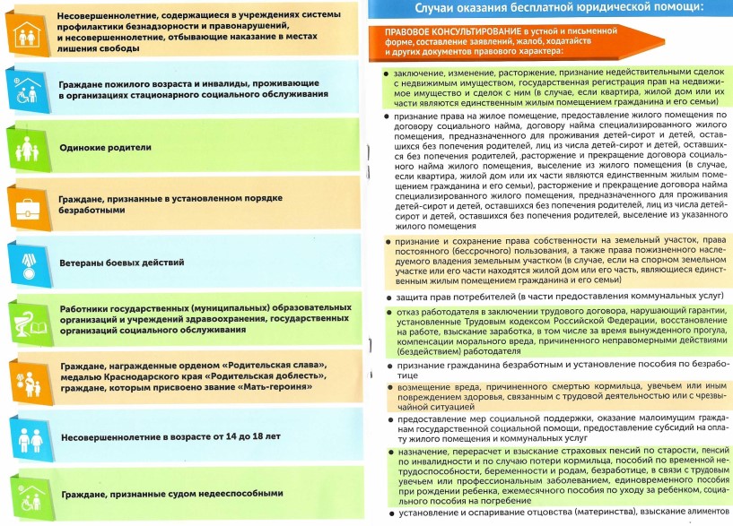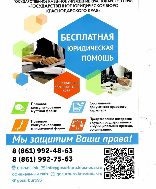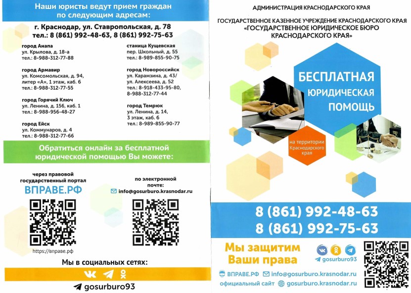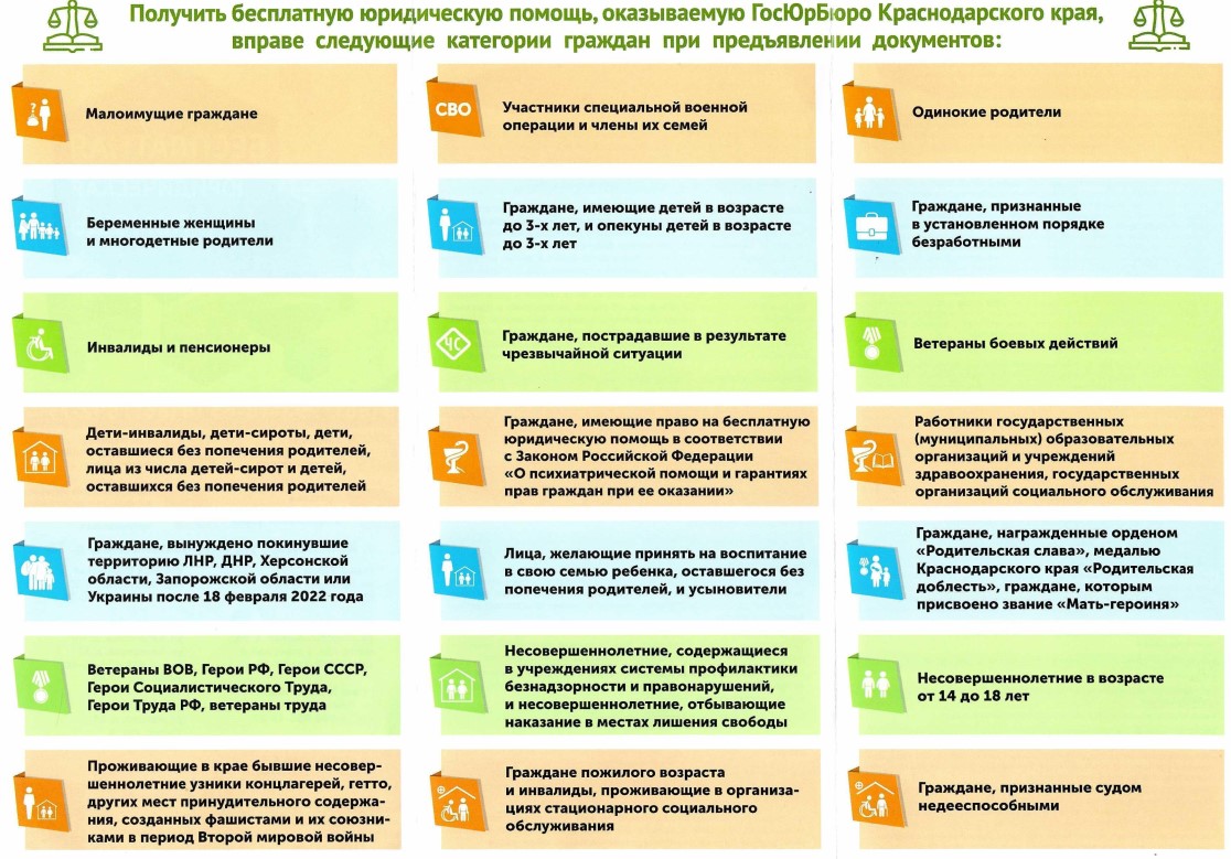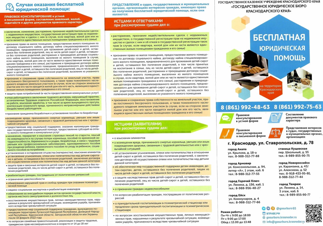 ГКУ КК «ГосЮрБюро Краснодарского края», подведомственное администрации края, оказывает гражданам бесплатную юридическую помощь при совпадении категории граждан и случая оказания такой помощи в рамках Федерального закона № 324-ФЗ, Закона Краснодарского края № 2697-КЗ в виде правового консультирования в устной и письменной форме, составления документов правового характера и представления интересов в судах, государственных и муниципальных органах, организациях.