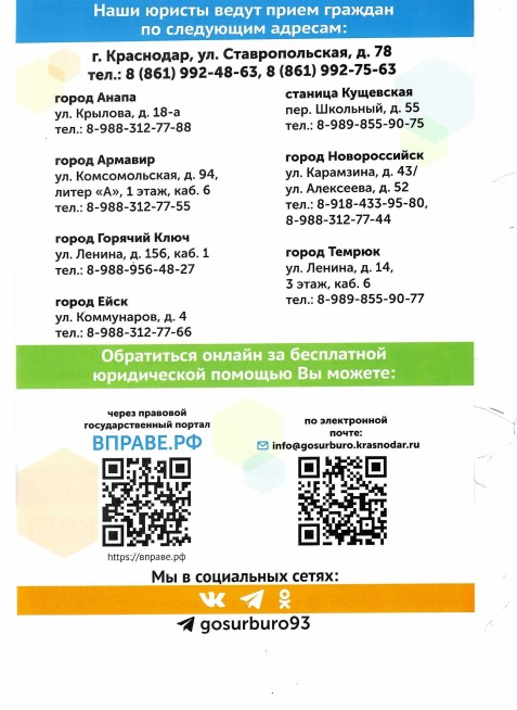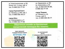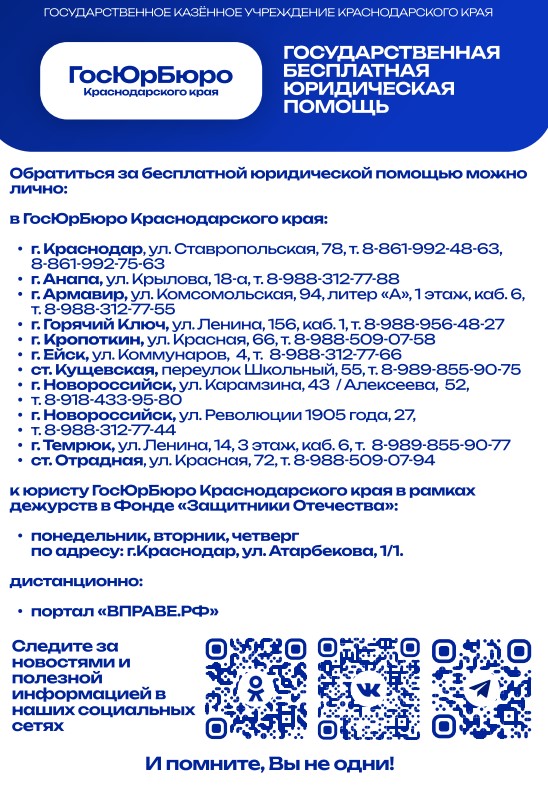 Графики проведения выездных дней оказания бесплатной юридической помощи и адреса их проведения размещены на официальном сайте ГКУ КК «ГосЮрБюро Краснодарского края» - gosurburo.krasnodar.ru. Также на сайте размещена важная информация для участников специальной военной операции и членов их семей о предоставляемых льготах, выплатах, мерах социальной поддержки, правовые новости, касающиеся реализации указанными лицами своих прав и внесенных изменений в законодательство.