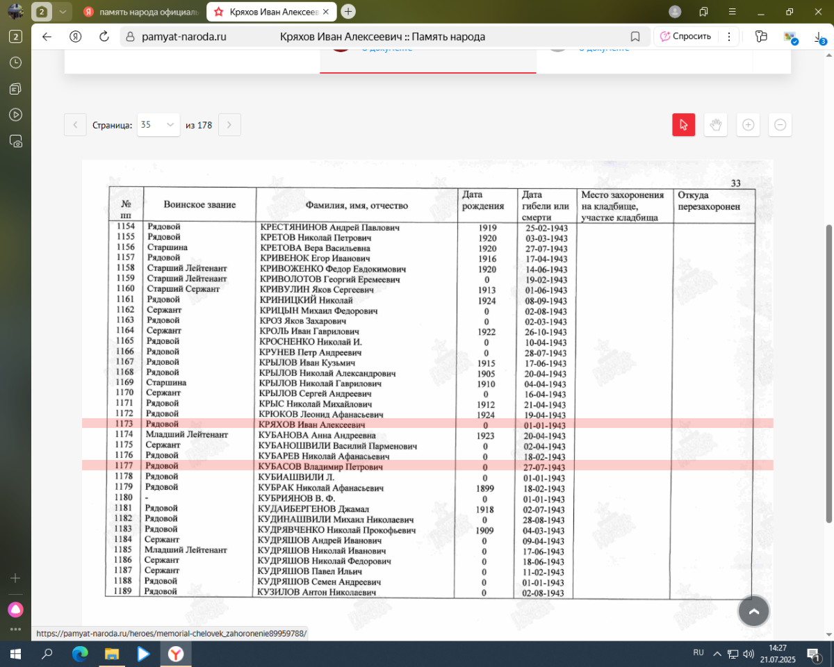 Наличие сведений о человеке в государственной информационной системе "Интерактивный сервис "Память народа" (https://pamyat-naroda.ru/)
