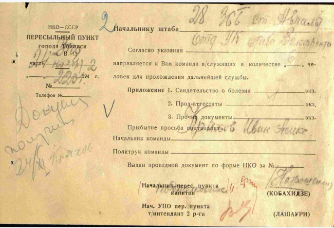 Военно- пересыльный пункт Закавказского военного округа, г. Тбилиси, 28 стрелковая бригада, эвакуационный госпиталь 3377.