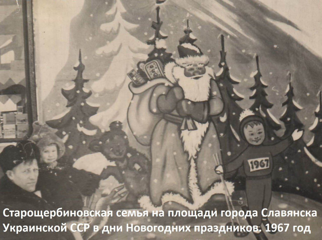 С начала 1960-х на центральных площадях многих городов и сельских населенных пунктов нашей страны устанавливали живые ели. Новогоднюю красавицу наряжали одними и теми же игрушками каждый год – стеклянными елочными шарами, фигурками сказочных персонажей. На верхушку водружали красную звезду. Гирлянда была простой, с обычными маленькими лампочками, которые по очереди мигали, но казались волшебными огнями. Под елками обязательно размещались большие фигуры Деда Мороза и Снегурочки. И хотя эти Деды Морозы и Снегурочки в те годы были не такие красивые, как сейчас, но они дарили огромную радость и праздничное настроение взрослым и детям. Эти Новогодние елки на площадях были центром притяжения для советских семей, местом, где царила праздничная атмосфера. На украшенные площади приходили целыми семьями, фотографировались, общались. Особенно радовались дети, потому что огромная нарядная елка с мерцающими огоньками и большие фигуры Деда Мороза и Снегурочки казались сказочными. В 1960-е годы, в целом, советские люди жили дружно, общались, ездили в гости к родственникам и друзьям, и куда бы они не приезжали, все площади нашей страны, были обязательно украшены к Новому году. На старых фотографиях мы видим, как схожи Новогодние елки в станице Старощербиновской и в городе Славянске Украинской ССР. Новый год – это не просто праздник, это общее состояние души, которое объединяет всех людей.