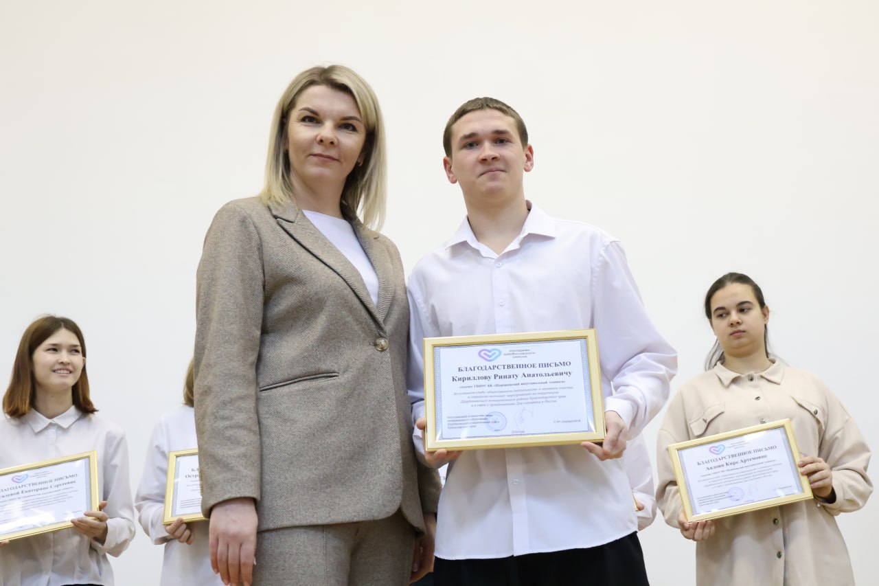 Большую и дружную команду молодых и активных ребят техникума с Днём студента приехала поздравить заместитель главы района Ирина Киселева. Заместитель главы поздравила студентов с предстоящим праздником, отметив их активную жизненную позицию и пожелала удачи во всех начинаниях. Праздник – это, конечно же, повод отметить лучших! За активное участие в социально-значимой жизни нашего района и успешное обучение по выбранной профессии Ирина Сергеевна вручила студентам техникума Благодарственные письма. Свои творческие номера ребятам подарили артисты Новощербиновского СДК и народный цирк «Скоморохи»