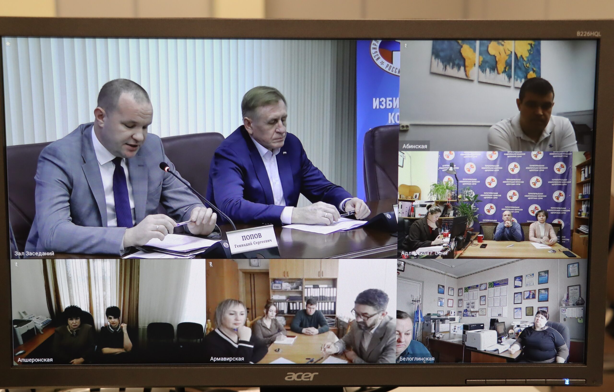 В избирательной комиссии Краснодарского края состоялось планерное совещание с территориальными избирательными комиссиями в режиме видеоконференцсвязи, в котором приняли участие председатель территориальной избирательной комиссии Щербиновская Юлия Галкина и системный администратор ГАС «Выборы» Евгений Шапарь.