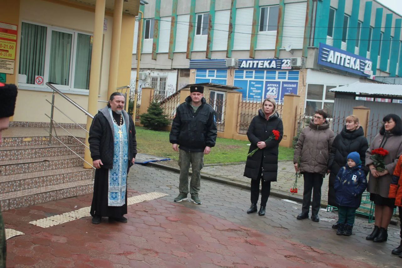 штатный священник храма Покрова Пресвятой Богородицы станицы Старощербиновской протоиерей Александр Барашкин, лидер Соза казачьей молодёжи Щербиновского района Вадим Тицкий, участники и ветераны специальной военной операции.