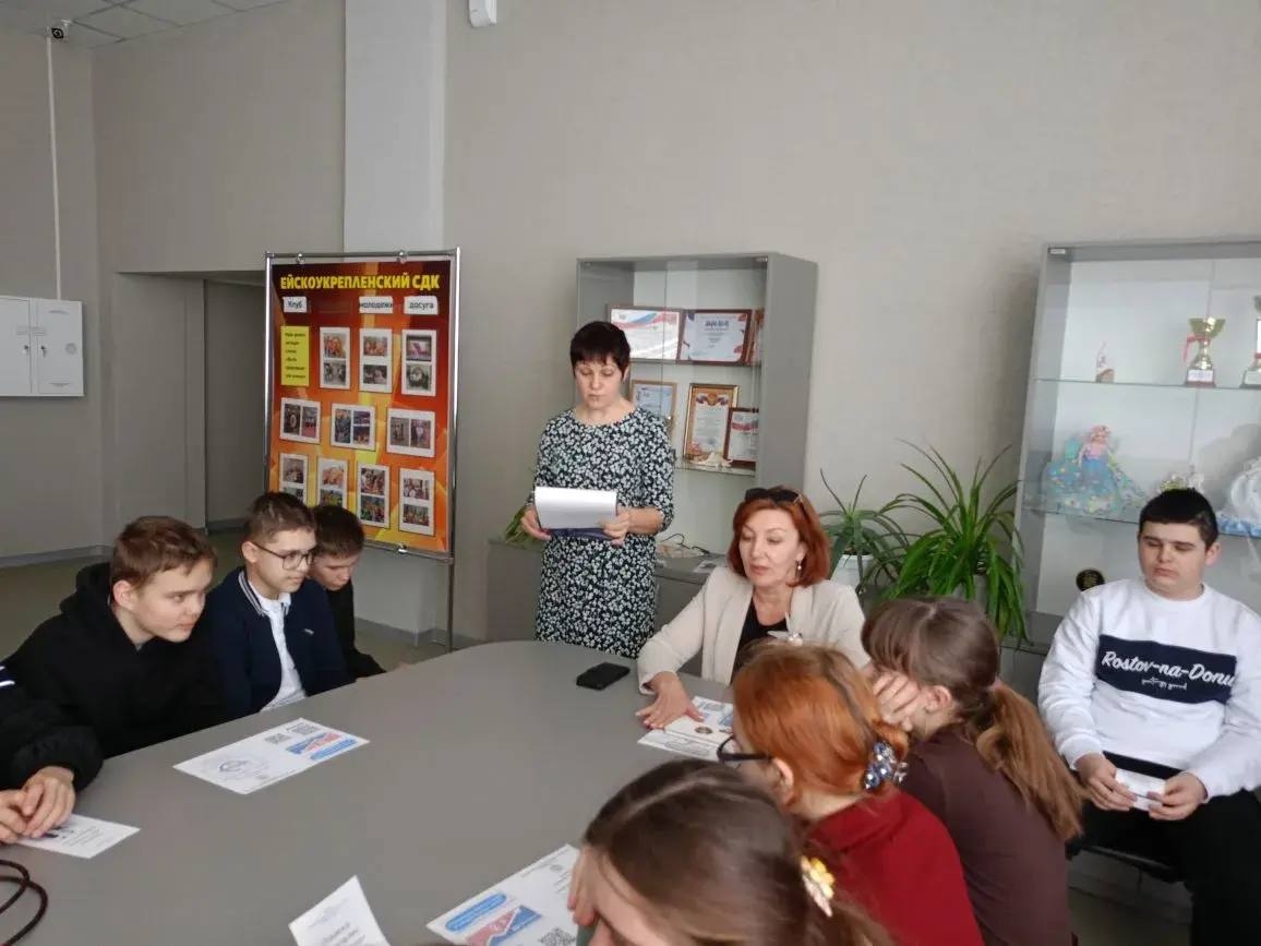 Для учащихся старших классов МБОУ СОШ № 7 имени Г.Т. Ткаченко на базе МКУК «Ейскоукрепленский СДК» проведен час молодого избирателя «Избиратель: права и обязанности», в рамках Дня молодого избирателя, проводимого на территории Краснодарского края с 16 февраля по 16 марта 2026 года.