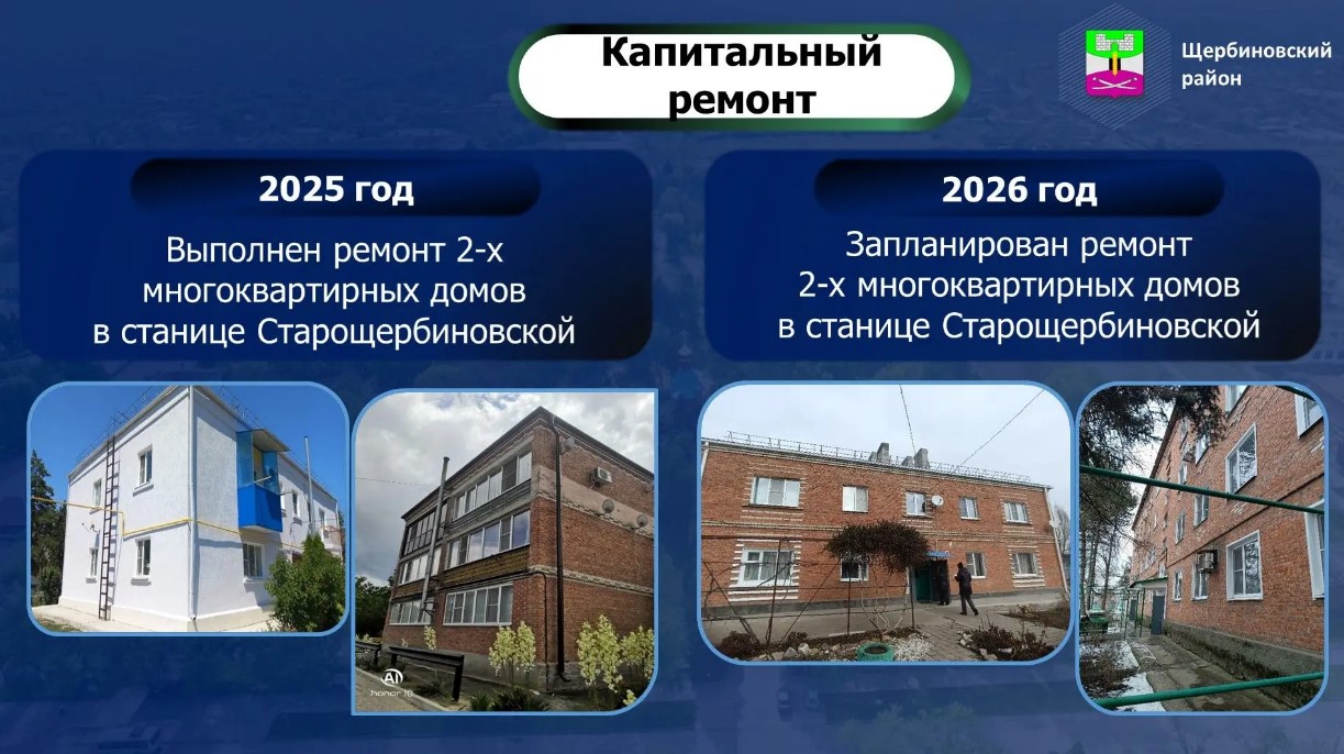 По программе капитального ремонта многоквартирных домов на территории муниципалитета в 2025 году выполнен плановый капитальный ремонт двух многоквартирных домов в станице Старощербиновской по улице Красная, 67, и Советов, 41, на сумму 6 млн. рублей. В 2026 году запланирован ремонт еще двух многоквартирных домов в станице Старощербиновской по улицам Краснопартизанская, 130 и Красноармейская, 81. В 2027 году планируем отремонтировать многоквартирные дома в райцентре по улице Лермонтова 31 и Ленина 73.