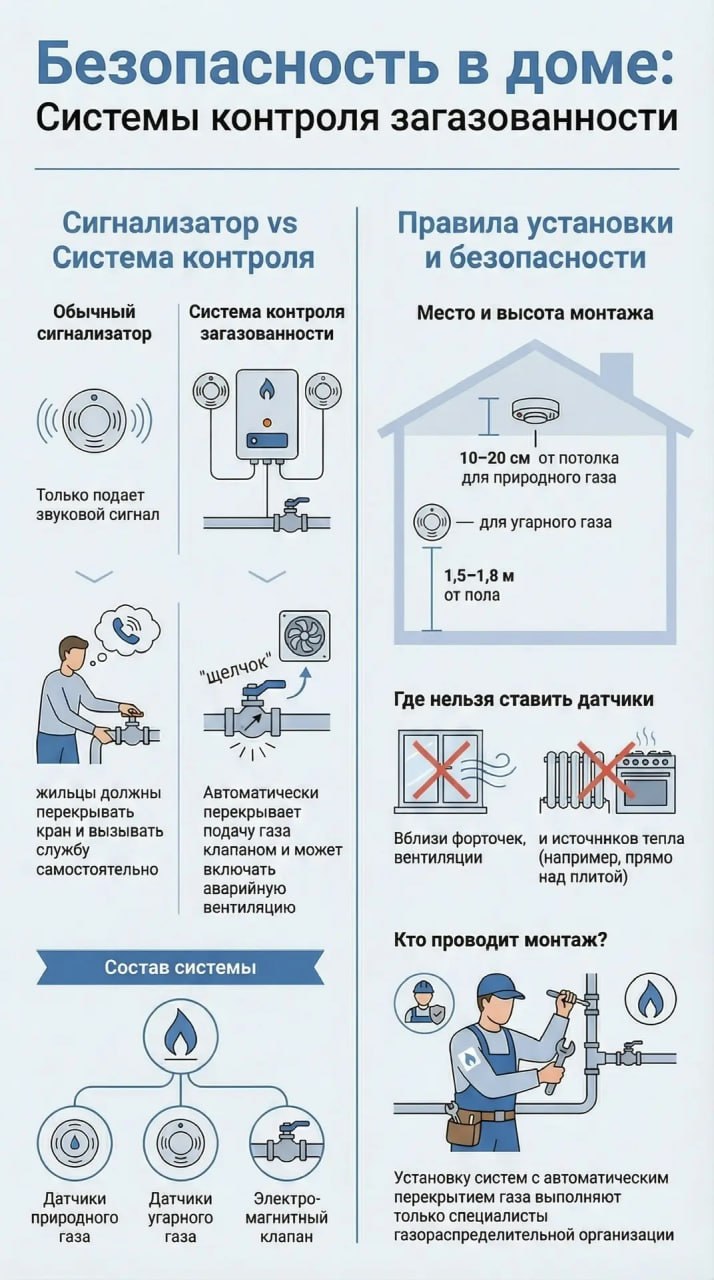 Сигнализатор загазованности - это базовая защита: он подаст громкий сигнал, если концентрация газа (метана или угарного) превышена. Дальше действовать нужно самостоятельно: перекрыть газ, проветрить помещение и вызвать аварийную службу. Система контроля загазованности - более продвинутое решение. Она не только предупреждает, но и может автоматически предотвратить опасную ситуацию: - перекрывает подачу газа - включает вентиляцию (при наличии) - в некоторых случаях отправляет уведомление на смартфон Что входит в систему: - датчик горючего газа - датчик угарного газа - электромагнитный клапан Важно: - оборудование работает от сети 220В - датчик газа устанавливается под потолком (10-20 см) - датчик угарного газа - на уровне дыхания (1,5-1,8 м) - не размещайте датчики рядом с окнами, вентиляцией и источниками тепла Обратите внимание: простые сигнализаторы можно установить самостоятельно, а системы с автоматическим перекрытием газа - только с участием специалистов вашей газораспределительной организации. ??Газ - это безопасно, если знать правила. ??Телефон экстренной газовой службы 104.