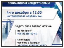 В прямом эфире Вениамин Иванович ответит  на вопросы жителей края. В 12:00 на телеканале «Кубань 24» пройдет «Прямая линия». Свои вопросы с завтрашнего дня вы можете задать: через чат-бот в телеграм «Вопрос Кондратьеву» https://t.me/direct_line_23_bot, по многоканальному телефону:  8(861)268-60-44.