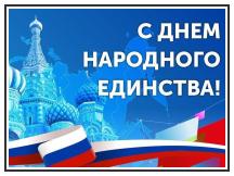 Дорогие друзья! Поздравляю вас с Днём народного единства, праздником, олицетворяющим исторические традиции патриотизма, гражданственности и сплоченности нашего народа. Примите искренние поздравления с Днем народного единства!