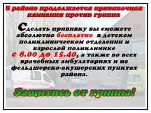 Уважаемые жители района! Обратите внимание на то, что в районе продолжается прививочная кампания против гриппа. "Сделать прививку вы сможете абсолютно бесплатно в детском поликлиническом отделении и взрослой поликлинике с 8.00 до 15.40, а также во всех врачебных амбулаториях и на фельдшерско-акушерских пунктах района.