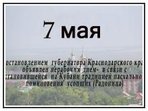 Обратите внимание на то, что постановлением главы администрации (губернатора) Краснодарского края от 16 апреля 2019 года, в связи с установившейся на Кубани традицией пасхального поминовения усопших (Радоница), 7 мая на Кубани объявлен нерабочим днем.