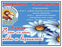 Уважаемые жители района, приглашаем всех вас 8 июля в 19.00 на праздничный концерт, посвящённый прекрасному празднику - Дню семьи, любви и верности.  Концерт пройдёт на летней эстраде в парке культуры и отдыха станицы Старощербиновской. Также вечером в парке будут работать различные тематические площадки, будут оформлены фотозоны.