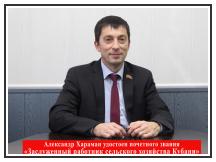 Исполнительный директор СПК (колхоза) «Знамя Ленина» Александр Хараман удостоен почетного звания «Заслуженный работник сельского хозяйства Краснодарского края». Высокой награды наш земляк удостоен за многолетний добросовестный труд, большой личный вклад в развитие отрасли сельского хозяйства нашего муниципалитета. В агропромышленном комплексе Александр Юрьевич  трудится почти 30 лет.