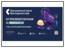 Промышленный портал Краснодарского края (далее – Портал) представляет собой единый информационный ресурс, объединяющий актуальные сведения промышленного комплекса, действующие меры государственной поддержки, а также инструменты для развития отрасли (www.promkuban.ru).