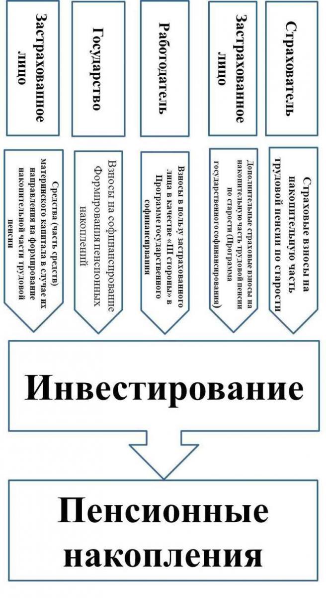 Средства пенсионных накоплений не идут на выплаты страховой части трудовой пенсии нынешних пенсионеров, формируются за счёт взносов работодателя на обязательное пенсионное страхование, дополнительных страховых взносов, уплачиваемых в рамках Программы государственного софинансирования пенсии, средств материнского (семейного) капитала (в случае их направления на накопительную часть трудовой пенсии матери) и доходов от инвестирования.
