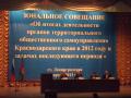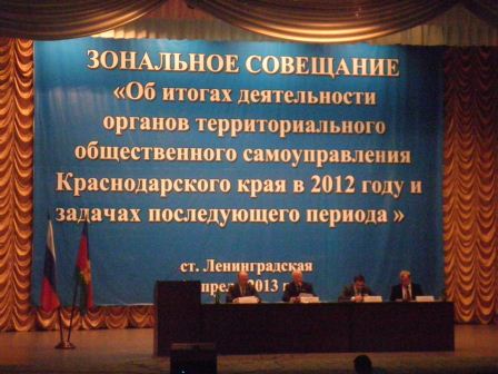 Зональное совещание по итогам деятельности органов территориального общественного самоуправления (ТОС) Краснодарского края в 2012 году и задачах на последующий период состоялось в ст. Ленинградской 09 апреля 2013 г. В нем приняли участие: первый заместитель председателя Законодательного Собрания Краснодарского края И.М.Петренко, первый заместитель директора департамента внутренней политики администрации Краснодарского края А.Д.Черненко, представители краевой администрации, главы и руководители представительных органов муниципалитетов, руководители органов ТОС, ветеранских организаций, представители казачества, участковые уполномоченные полиции.