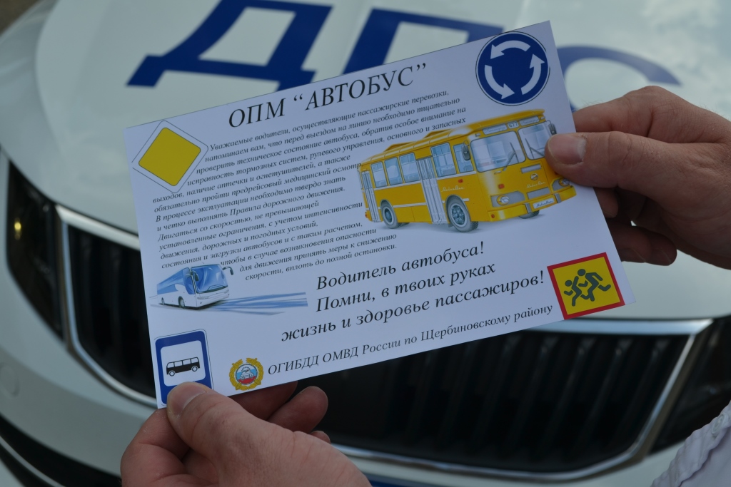 Сотрудники ОГИБДД и ОДПС ОГИБДД ОМВД России по Щербиновскому району в рамках 3 этапа оперативно-профилактического мероприятия "Автобус" проводят профилактические беседы с водителями, осуществляющих пассажирские перевозки, напоминая о том, что перед выездом на линию необходимо тщательно проверять техническое состояние автобусов, обращая особое внимание на исправность тормозных систем, рулевого управления, основного и запасных выходов, наличие аптечки и огнетушителей, а также обязательно пройти предрейсовый медицинский осмотр. Особое внимание уделено на соблюдение водителями Правил дорожного движения, движение со скоростью, не превышающей установленные ограничения.