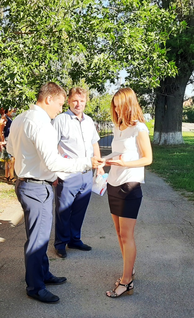На торжественной линейке в СОШ № 2 председатель Местного отделения ДОСААФ России Щербиновского района Александр Даценко поздравил учащихся с Днем Знаний, пожелал им успехов, отличных отметок и вручил Благодарности членам военно – патриотического клуба имени Николая Курина за высокие достижения в военно – патриотической работе и по итогам мероприятий «Юнармейское лето – 2020» и Евгению Море, руководителю клуба за высокие достижения в военно – патриотической работе, и за подготовку молодежи к службе в Вооруженных силах Российской Федерации.