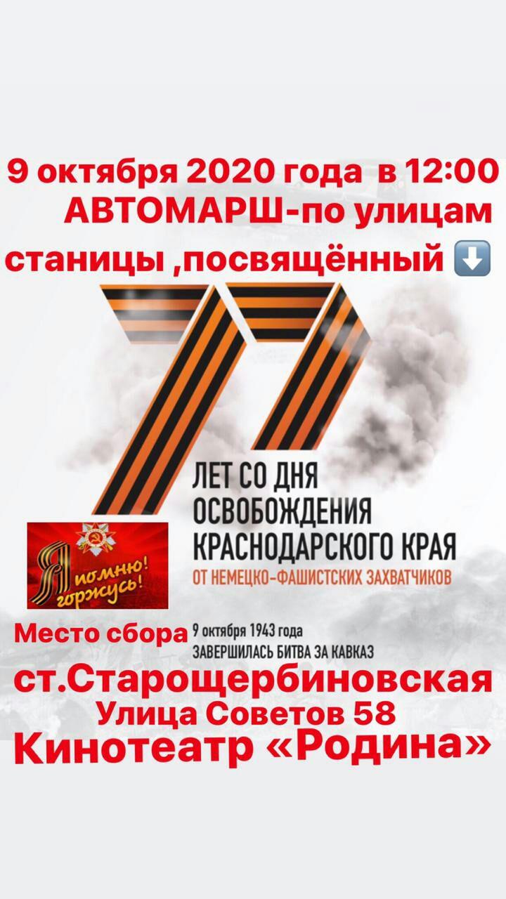 9 октября, в день 77-летия со дня освобождения Краснодарского края и завершения Битвы за Кавказ, состоится Автомарш по улицам станицы Старощербиновской. Приглашаем всех принять участие. Место сбора – территория возле кинотеатра «Родина», начало движения в 12.00.