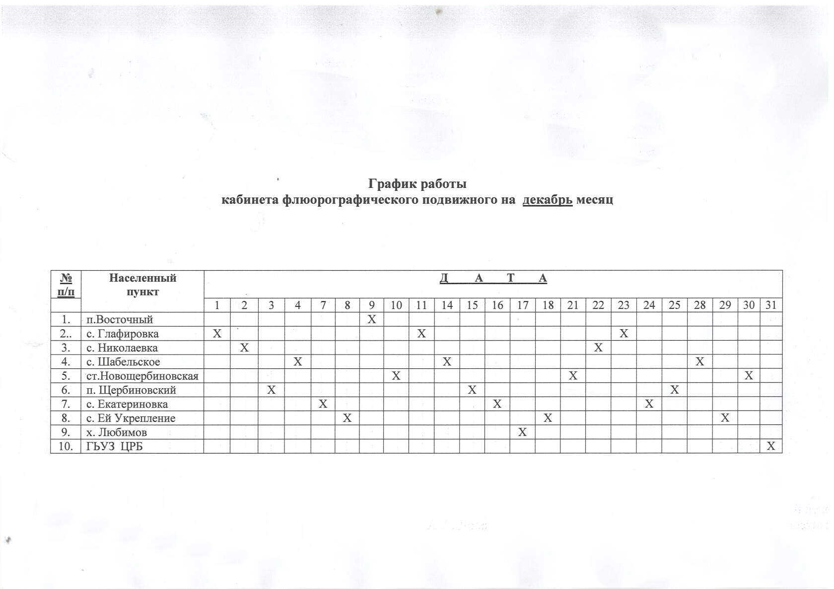 График передвижного рентгенологического кабинета на декабрь