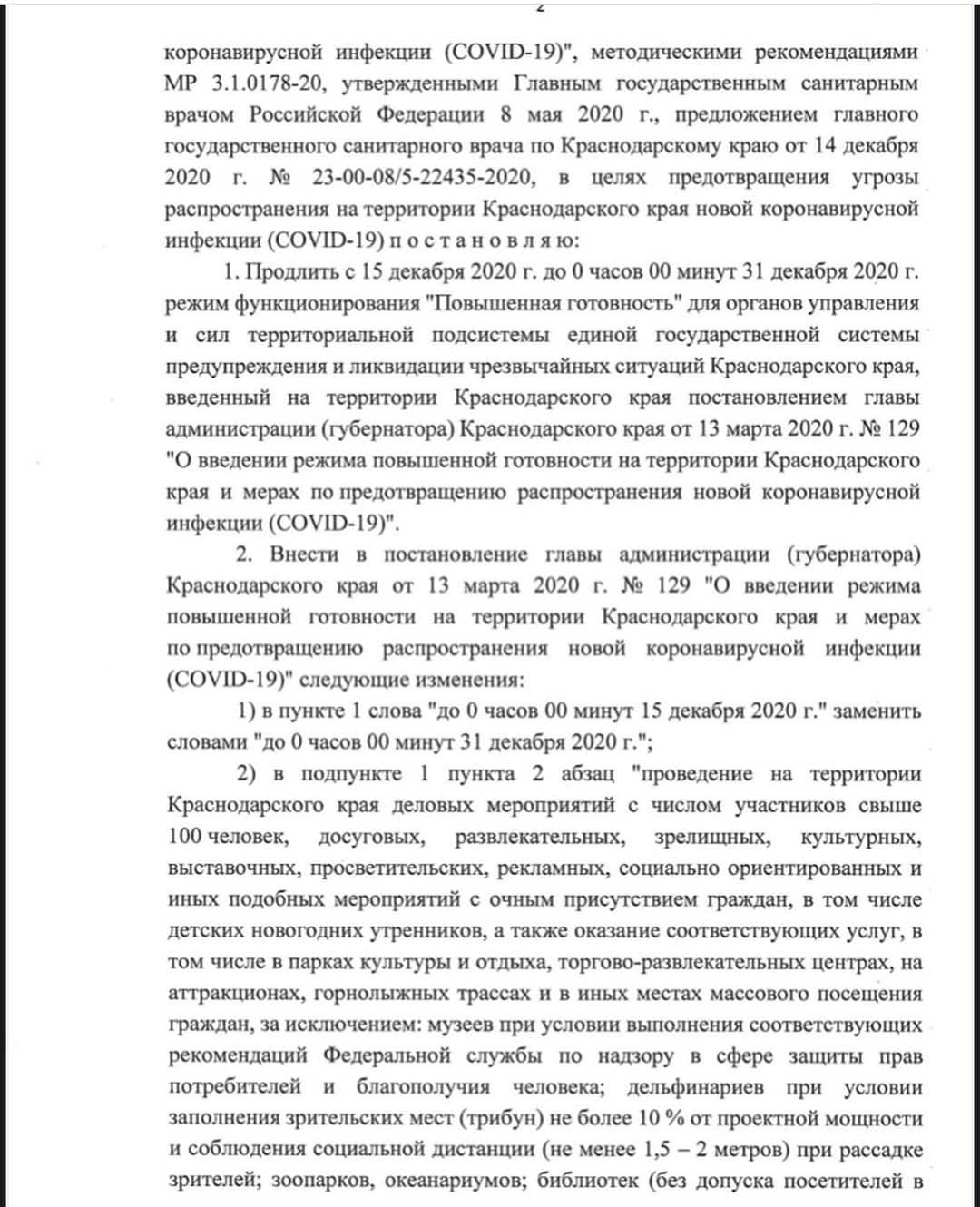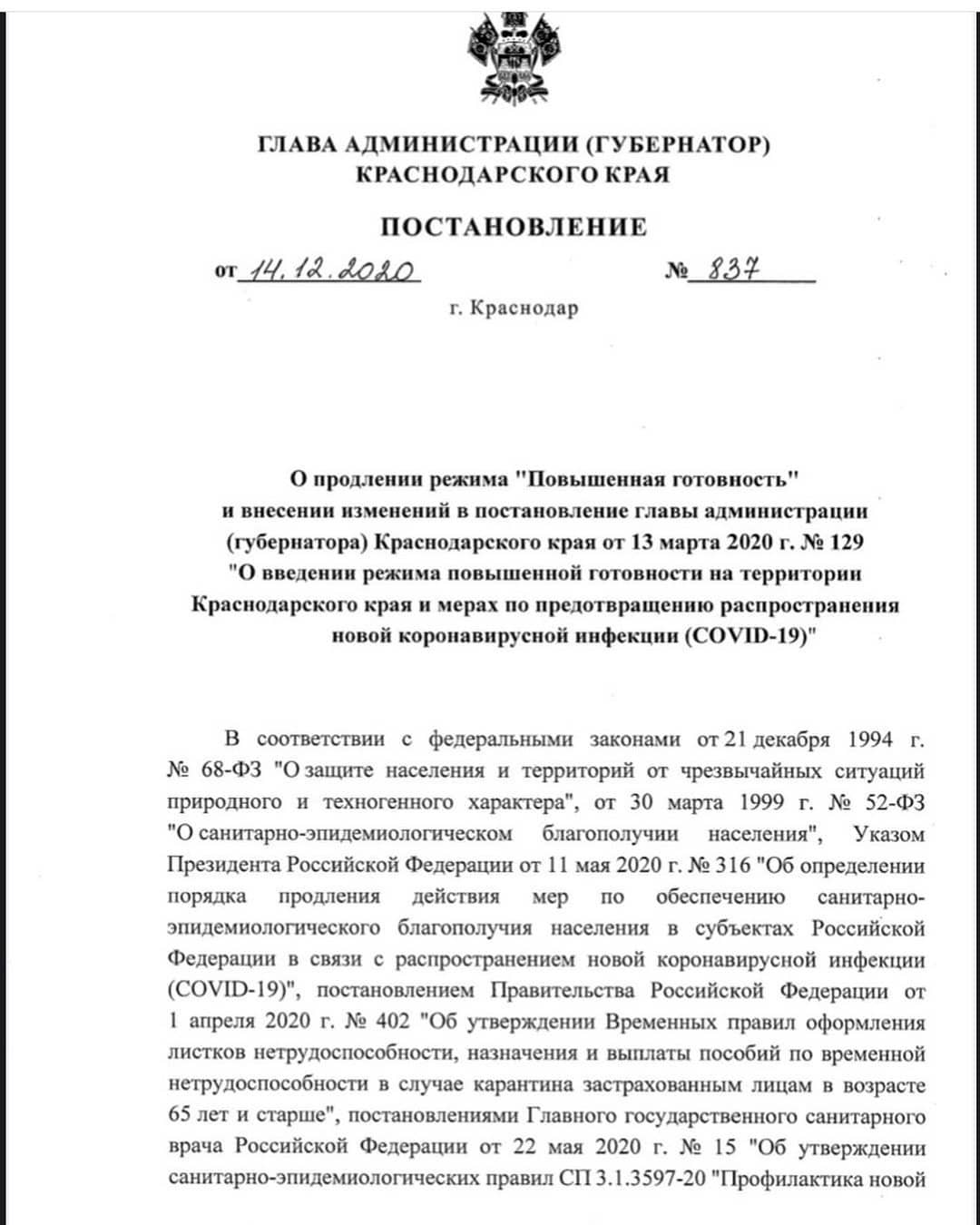 На Кубани режим повышенной готовности продлен до 31 декабря