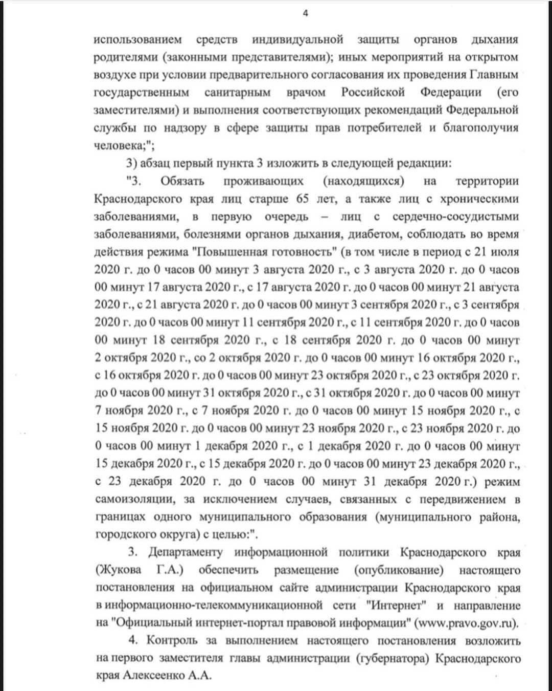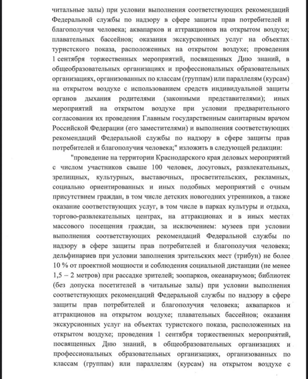 Соответствующее постановление подписал губернатор края Вениамин Кондратьев. Жители и гости, находящиеся на территории края, по-прежнему должны использовать средства защиты органов дыхания во всех общественных местах скопления людей, в том числе при посещении объектов торговли, бытового обслуживания, вокзалов и иных зданий, в общественном транспорте, такси, на парковках, в лифтах, а также на свежем воздухе. Организации края и индивидуальные предприниматели обязаны обеспечить соблюдение масочного режима работниками и посетителями. Кроме того, все граждане должны соблюдать социальную дистанцию в 1,5 метра. Сохраняется запрет на проведение развлекательных, зрелищных, культурных мероприятий с очным присутствием людей за исключением случаев, прописанных в постановлении. А число участников деловых мероприятий по-прежнему ограничивается количеством в 100 человек. Жителям с болезнями органов дыхания, диабетом, сердечно-сосудистыми и иными хроническими заболеваниями, а также всем гражданам старше 65 лет необходимо соблюдать режим самоизоляции.