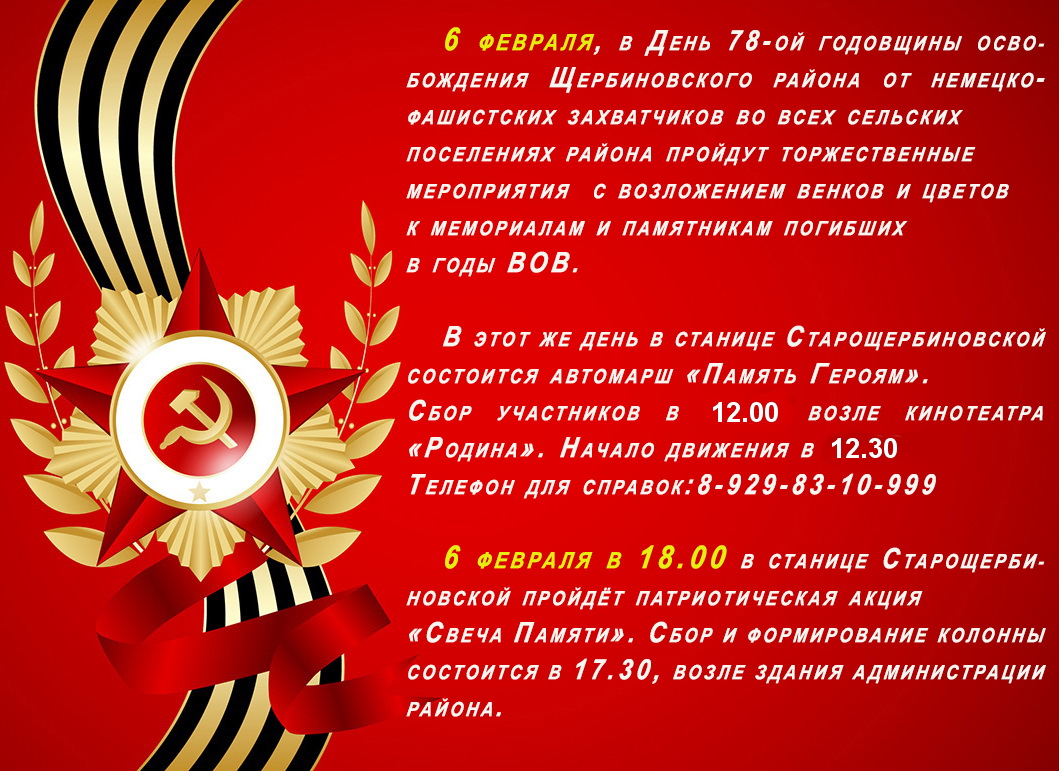 6 февраля, в день 78-ой годовщины освобождения Щербиновского района от немецко-фашистских захватчиков во всех сельских поселениях района пройдут торжественные мероприятия с возложением венков и цветов к мемориалам и памятникам погибших в годы ВОВ.