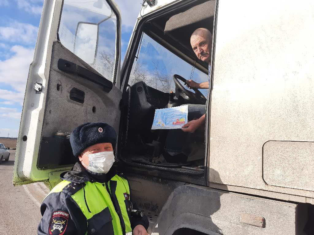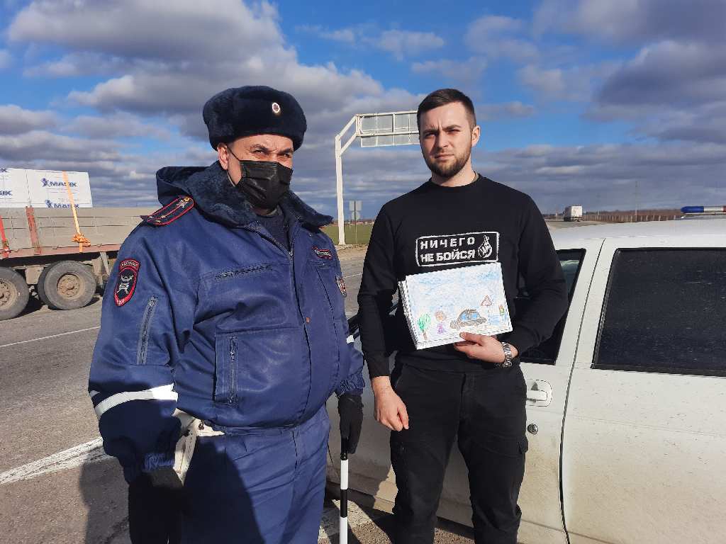 Юные художники совместно с педагогами подготовили рисунки, на которых изобразили возможные ситуации, с которыми могут столкнуться участники дорожного движения. Автоинспекторы вручали водителям детские рисунки с призывом быть внимательнее на дороге.
