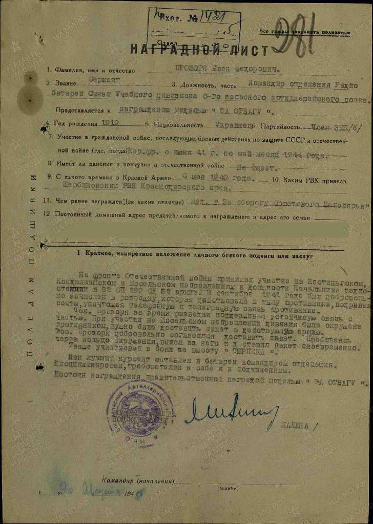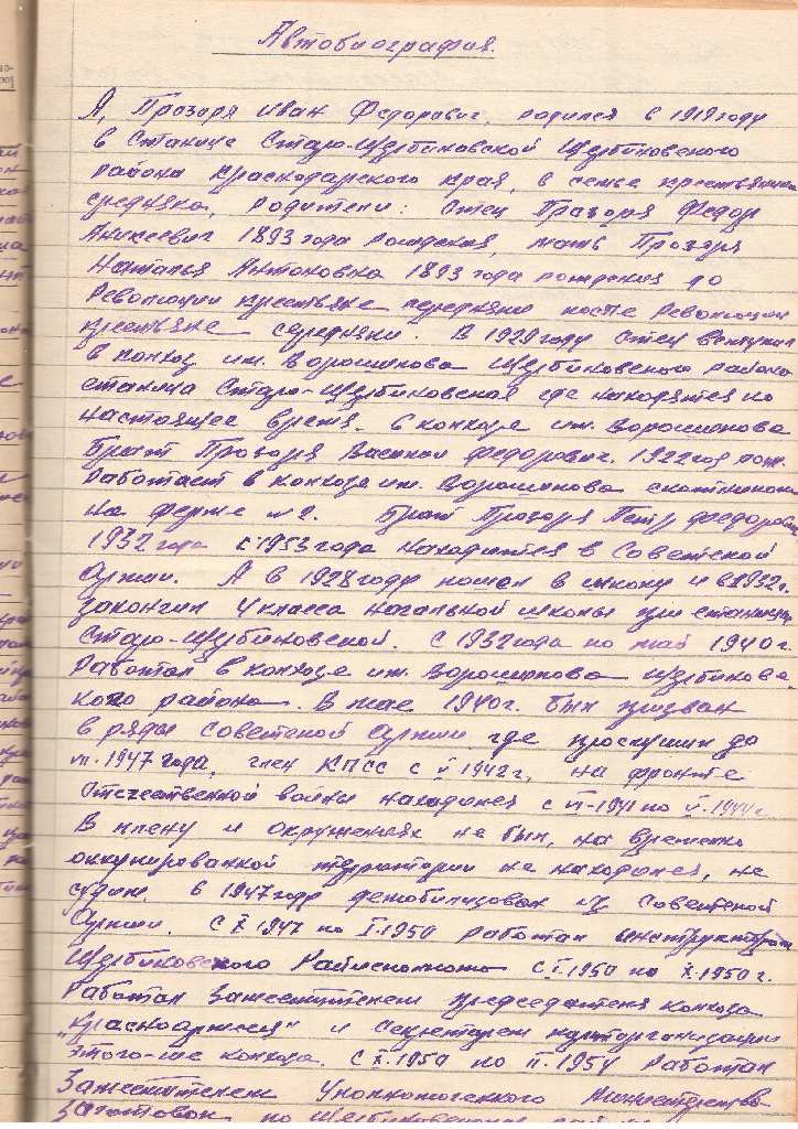 В начале семидесятых годов возглавлял районный архив ветеран Великой Отечественной войны Прозоря Иван Федорович, ни в автобиографии, ни в анкете даты его рождения обнаружено не было, только при полистном осмотре метрической книги записей актов о рождении по станице Старощербиновской за 1919 год была установлено, что Прозоря И.Ф. родился 25 мая 1919 года, из его автобиографии известно, что родился он в станице Старощербиновской, родители: отец Прозоря Федор Алексеевич, мать Наталья Антоновна - крестьяне, отец всю жить проработал в колхозе им. Ворошилова. В мае 1940 года Иван Федорович был призван в ряды Советской Армии, где прослужил до июля 1947 года. Прошел всю Великую Отечественную войну. С июня 1941 года по октябрь 1942 года был начальником радиостанции 821-го артиллерийского полка 289-й стрелковой дивизии на Северном фронте. С октября 1942 года по май 1944 года - секретарь парторганизации 821-го артиллерийского полка 289-й стрелковой дивизии 1 –го дивизиона, с 1944 по декабрь 1945 года - помощник командира взвода, старшина батареи связи 6-го артиллерийского полка. Иван Федорович имел много наград: медали «За боевые заслуги», «За оборону Советского Заполярья», «За победу над Германией», «За победу над Японией», а в 1985 году был награждён орденом Отечественной войны I степени.