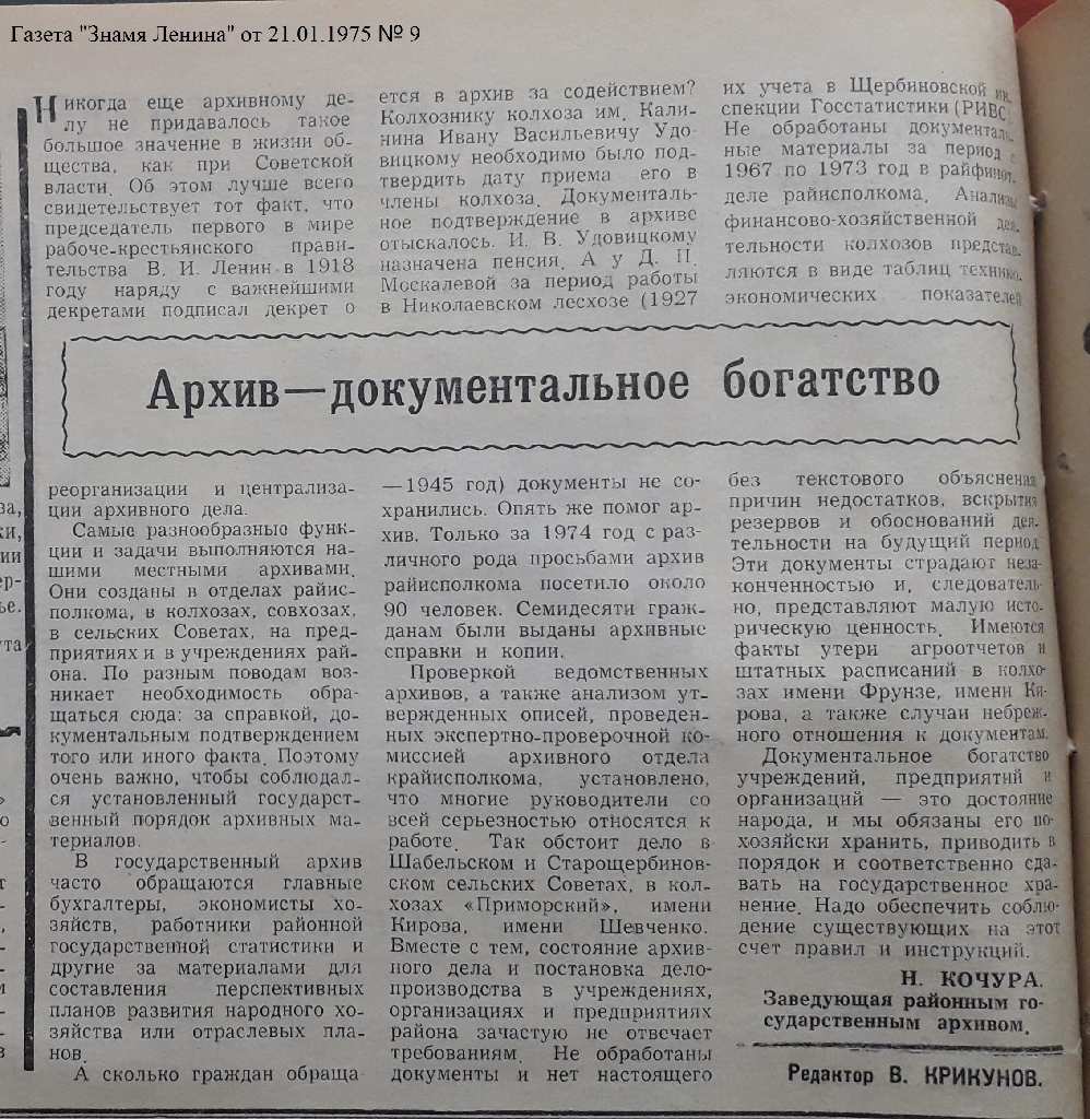 Как развивалась архивная служба в сороковые – пятидесятые годы в Щербиновском районе можно судить из статьи районной газеты «Калининец» от 6 февраля 1958 года № 16: «Архивные документальные материалы имеют огромное научное и практическое значение. Обеспечивать сохранность своих архивных фондов обязаны все государственные, общественные и хозяйственные учреждения и организации. В большинстве колхозов и учреждений района к хранению документальных материалов относятся с чувством большой ответственности. Хорошо организованно хранение архивных фондов в Екатериновском сельском Совета, Ей-Укрепленском сельпо, в Глафировском сельском Совете, в райиспокоме. Все эти организации сдали документальные материалы за период до 1952 года включительно в райгосархив. Документы, оставшиеся на хранение в этих учреждениях, находятся в хорошем состоянии. …