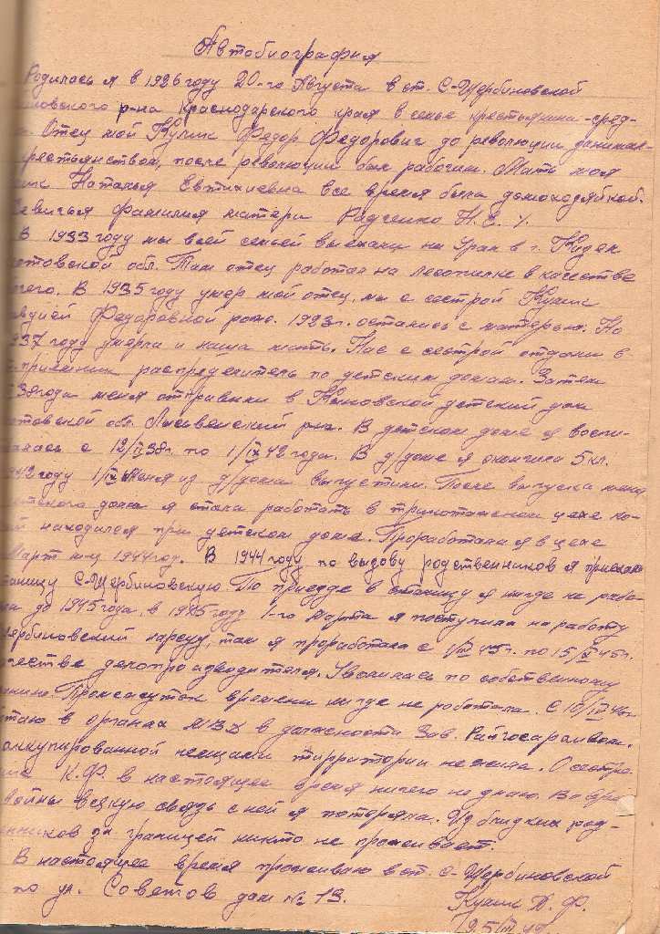 Как известно, результат любого дела зависит от человека, который это дело выполняет. В создании районного архива в разные годы принимали участие многие специалисты. У истоков была Кулик (Короткевич) Анна Федоровна. В архивном отделе хранится её автобиография, написанная собственноручно 25 марта 1947 года, и анкета, заполненная при приеме на работу в райгосархив, из которых мы узнаем, что Анна Федоровна родилась 20 августа 1926 года в станице Старощербиновской Щербиновского района, в семье крестьянина Кулик Федора Федоровича и домохозяйки Натальи Евтихиевны. Детство было тяжёлым, в 1933 году семья Кулик выехала на Урал, где в 1935 году от болезни умер отец Анны Федоровны, а затем в 1937 году скончалась и мать, Анна Федоровна с сестрой была определена в детский дом. С 16 летнего возраста в 1942 году девушка начала свою трудовую деятельность в трикотажном цехе при детском доме. В 1944 году вернулась на родину в станицу Старощербиновскую, где с 1 марта 1945 года продолжила свою трудовую деятельность в Щербиновском нарсуде в должности делопроизводителя, а с 10 апреля 1946 года поступила на должность заведующей райгосархивом в органах МВД.