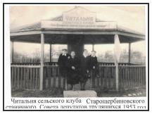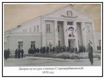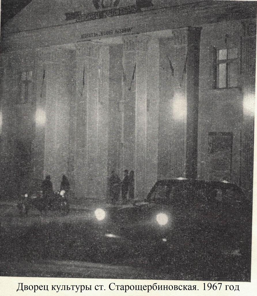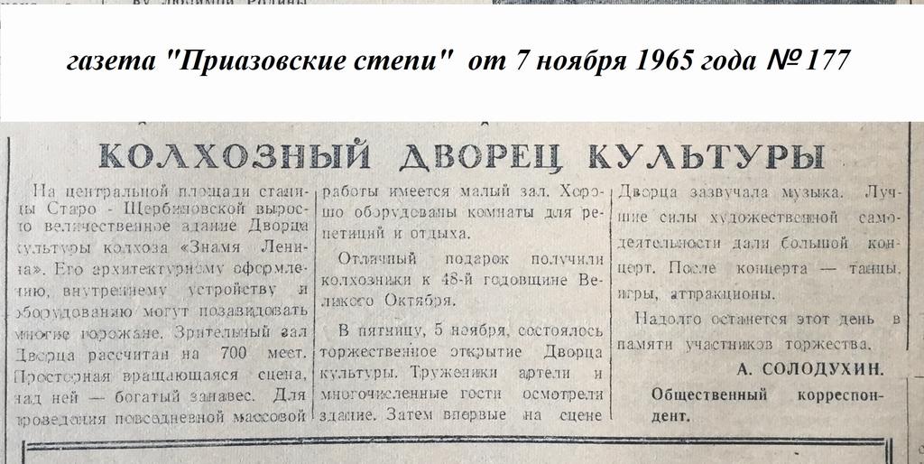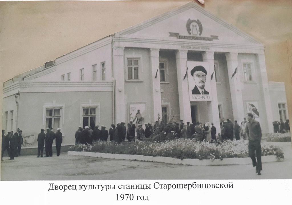 «……. По праву гордятся старощербиновцы своим Дворцом культуры. Такому очагу культуры позавидуют даже горожане: большое фойе, зрительный зал на 600 мест, поворотная сцена, комната для кружковой работы, просторный и светлый танцевальный зал, современная мебель, новейшее техническое оснащение. Колхоз вложил 400 тысяч рублей в строительство Дворца и 75 тысяч – в оборудование, да еще духовой и эстрадный оркестр, костюмы для участников художественной самодеятельности….