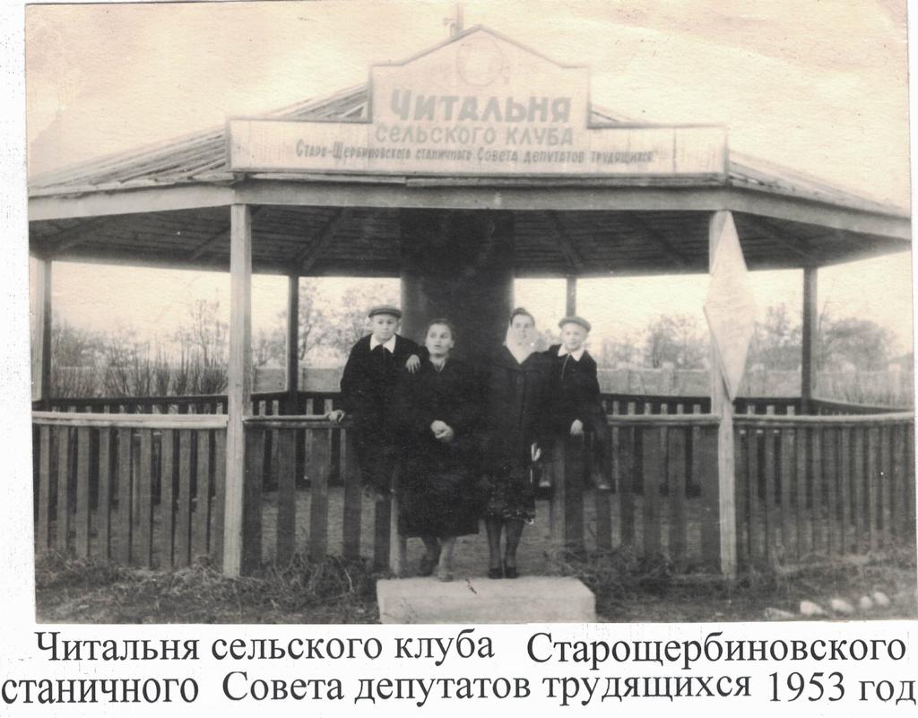 До 1965-го года центром культурной жизни станицы Старощербиновской был сельский клуб. Здесь работала «читальня», проводились культурные мероприятия, лекции, велись кружки, развивалась самодеятельность. Сюда спешили взрослые и дети. Клуб был местом, где было что посмотреть, и самому проявить свои способности. Секции по интересам сближали и объединяли людей, способствовали общению.