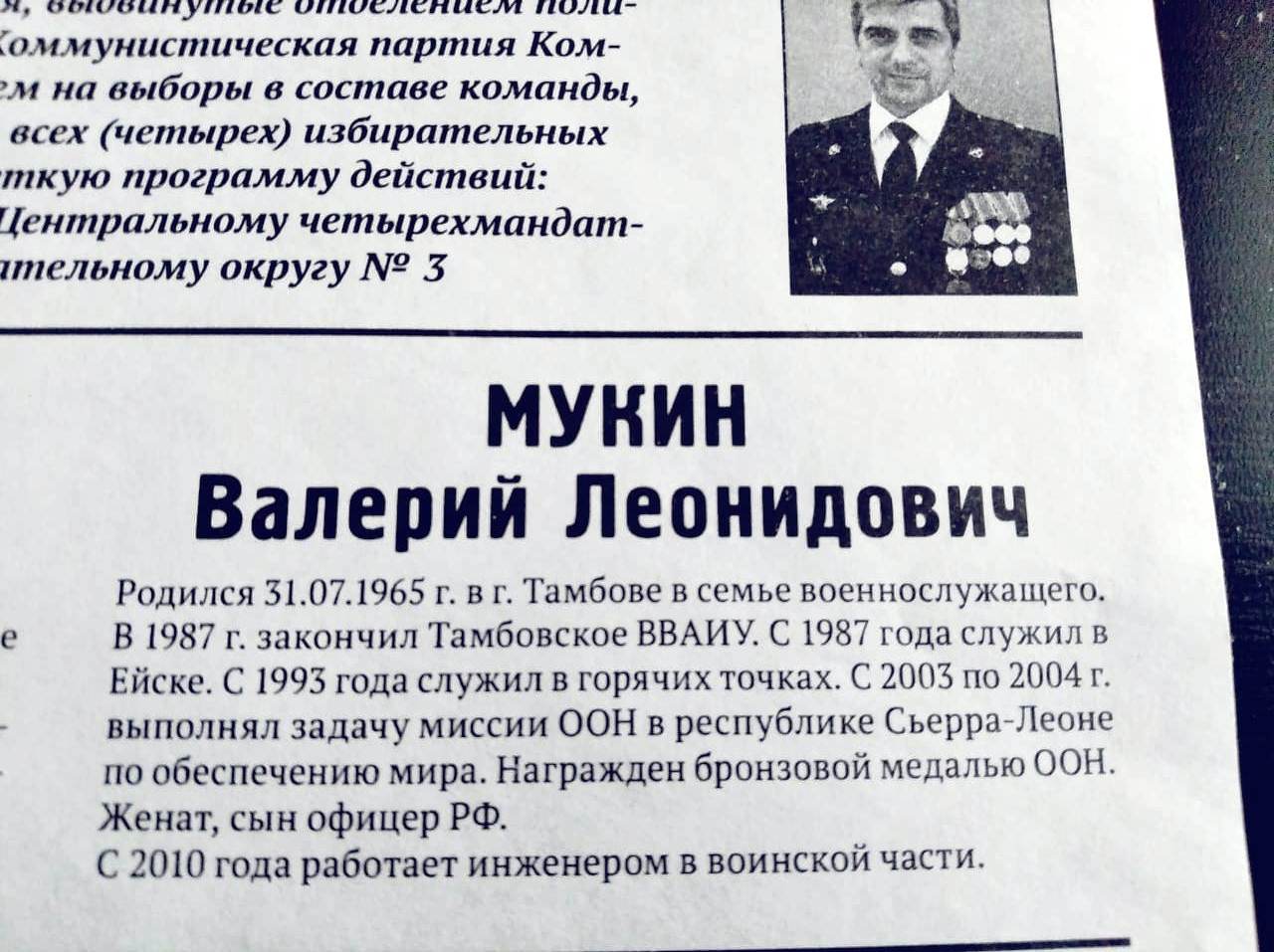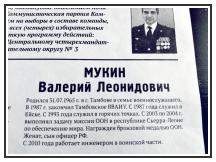 Мукин Валерий Леонидович, член ББ Ейского раойна, родился в 1965 году в г. Тамбове в семье военнослужащего. В 1987 году закончил Тамбовское ВВАИУ. С 1987 года служил в горячих точках: Абхазия, Чечня. С 2003 по 2004 год выполнял миссию ООН в республике Сьерра – Леоне по обеспечению мира. В 2008 году участвовал в операции попринуждениик миру в 2008 республики Грузия. С 2010 года работает инженером в военной части. Имеет награды: «70 лет Вооруженным силам СССР», «За отличие в военной службе 1,2,3 – степени, «За службу в Закавказье», медаль «Участнику контртеррористической операции», Бронзовая медалью ООН, «За службу на Северном Кавказе», большое количество юбилейных медалей.
