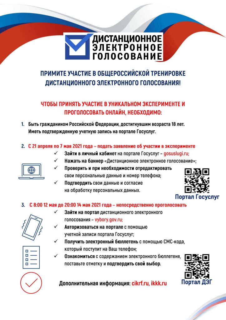 Пользователи Госуслуг, подавшие соответствующее заявление и получившие подтверждение, могут протестировать дистанционное электронное голосование, которое проводится в течение трех дней – с 8:00 12 мая до 20:00 14 мая 2021 года. Голосование будет организовано на портале дистанционного электронного голосования.