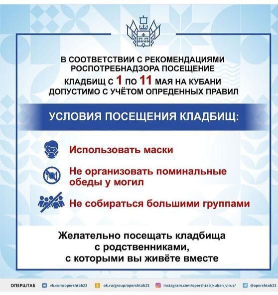 В соответствии с рекомендациями Роспотребнадзора, при посещении кладбищ необходимо использовать маски, не собираться большими группами и не устраивать поминальные обеды у могил.