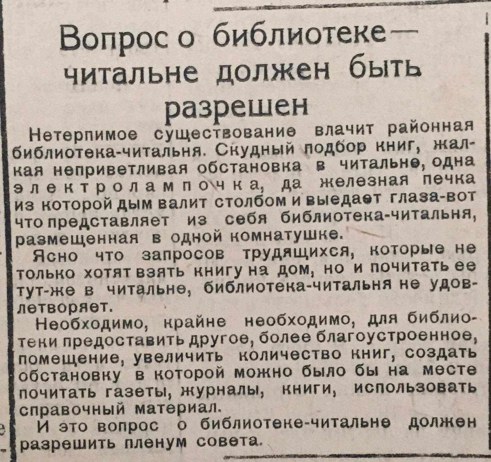 В районной газете «За большевистские колхозы» от 4 апреля 1937 года в статье «Вопрос о библиотеке должен быть разрешен» значится: «…Необходимо, крайне необходимо, для библиотеки предоставить другое, более благоустроенное помещение, увеличить количество книг, создать обстановку в которой можно было бы на месте почитать газеты, журналы, книги, использовать справочный материал…» (фонд № Р-102, опись № 1, дело № 2, лист № 19).